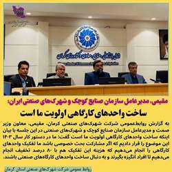 ����به گزارش روابط‌عمومی شرکت شهرک‌های صنعتی کرمان، مقیمی، معاون وزیر صمت و مدیرعامل سازمان صنایع کوچک و شهرک‌های صنعتی در این جلسه با بیان اینکه ساخت واحدهای کارگاهی اولویت ما است گفت: ما در دستور کار سال ۱۴۰۳ این موضوع را قرار دادیم که اگر مشارکت بحث خصوصی باشد ما تفکیک واحدهای کارگاهی را انجام می‌دهیم که هزینه این تفکیک هم با ۸۰ درصد تخفیف انجام می‌دهیم تا افراد انگیزه بگیرند و به دنبال ساخت واحدهای کارگاه‌های صنعتی باشند.