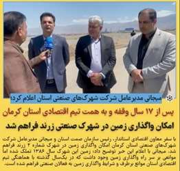 پس از ۱۷ ساله وقفه و به همت تیم اقتصادی استان کرمان امکان واگذاری زمین در شهرک صنعتی زرند فراهم شد